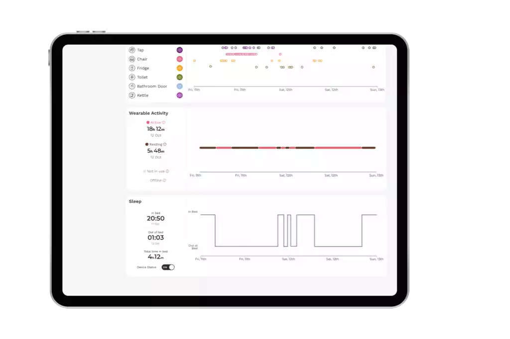 The MySense dashboard gives healthcare professionals continuous insight into Activities of Daily Living, helping them understand wellbeing trends between visits. Notifications provide timely awareness of changes, supporting safer discharge and helping avoid unnecessary readmission.